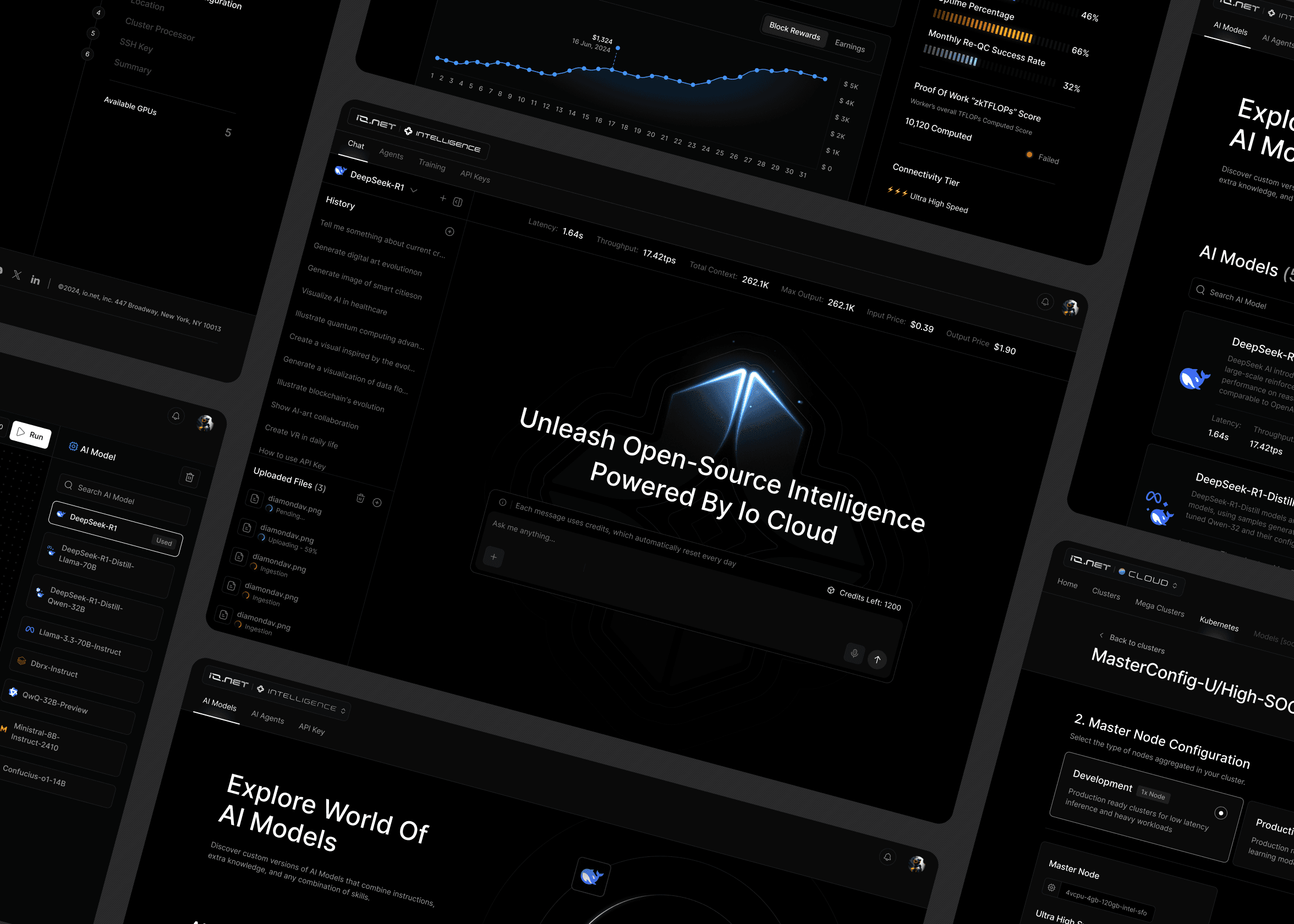 In parallel with brand, I led my team through a complete redesign of the io.net cloud platform. We built the design system that unified the experience across every product surface. We also launched IO Intelligence, io.net's AI product featuring chat, open-source models, and developer tools.