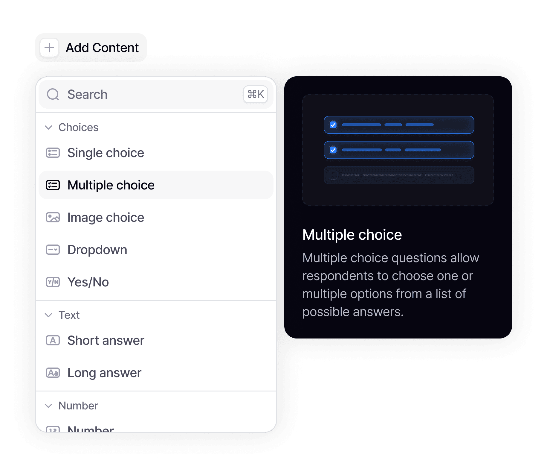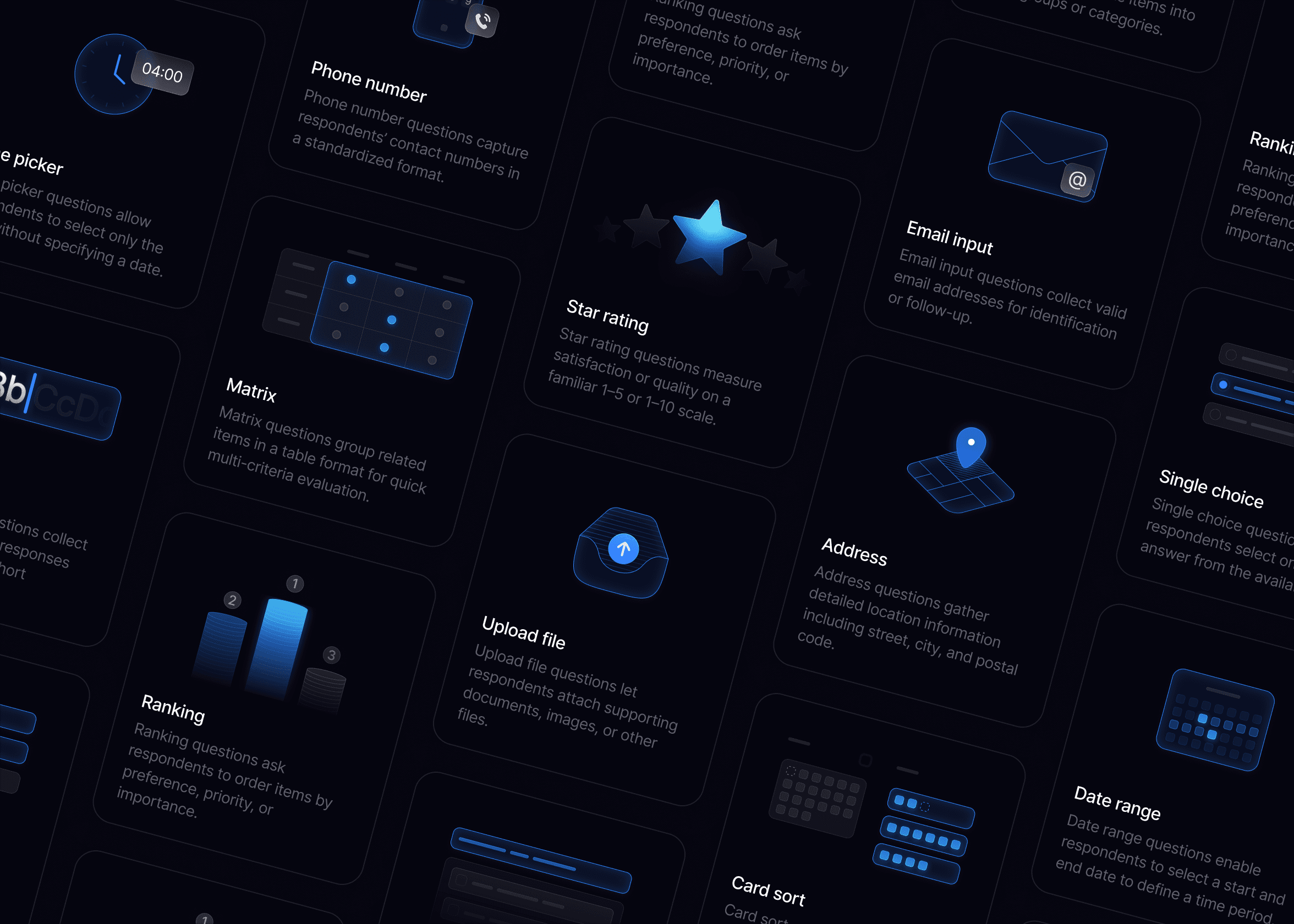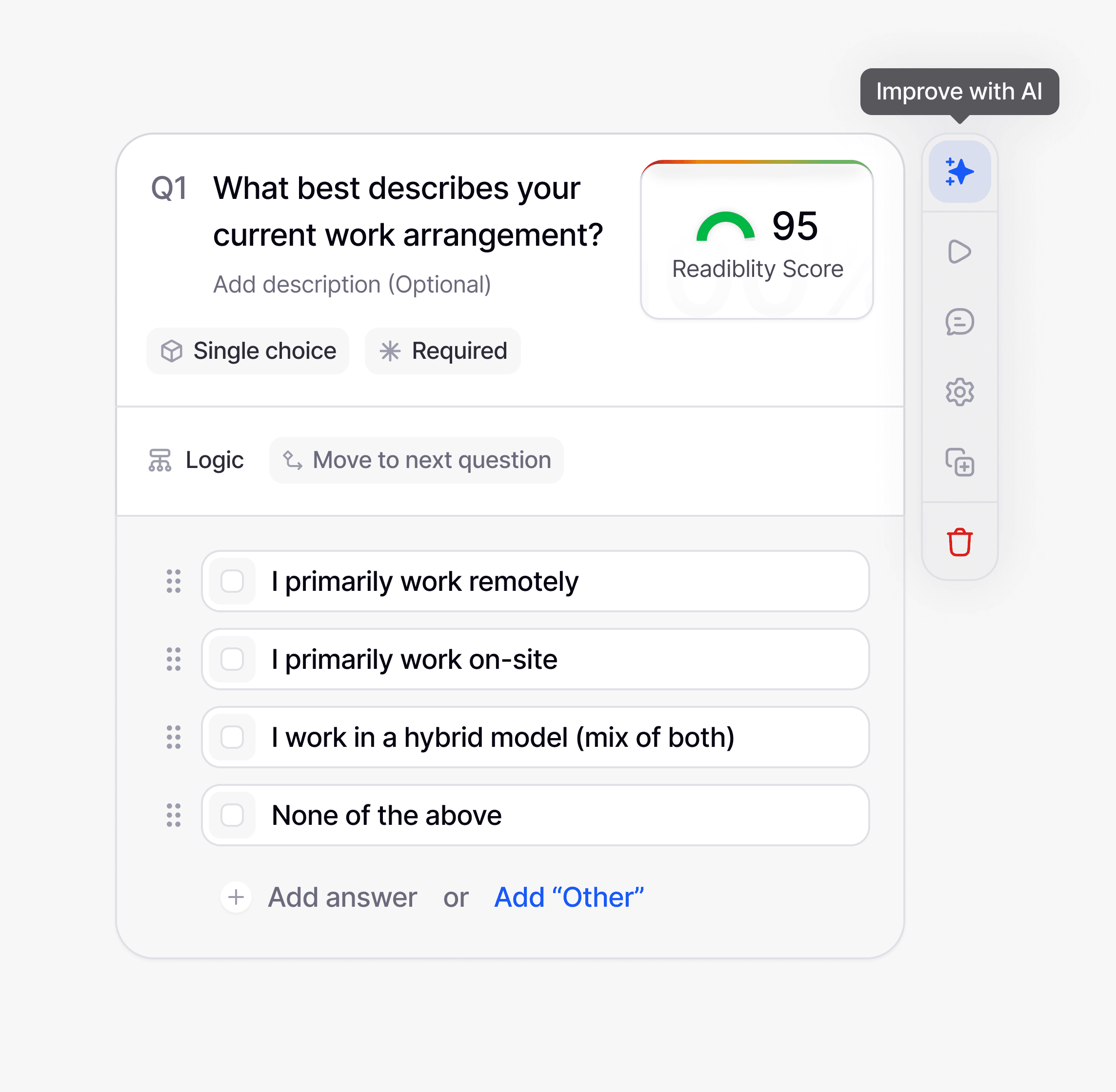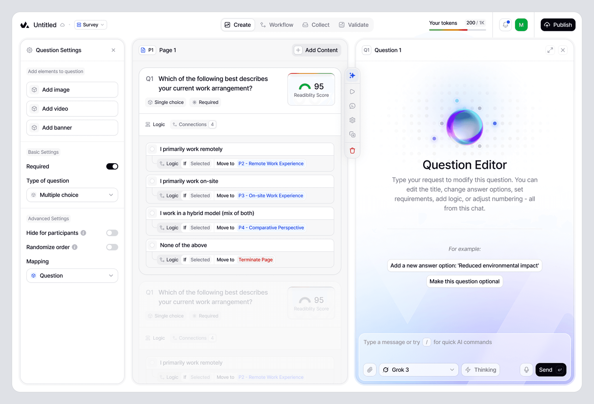 Create lets teams build any type of survey, manually or with AI, with readability scoring and bias detection running in real-time as questions are written. We designed a template system with production-ready layouts that can be fully customized, and an embedding system that drops surveys into any product or channel.